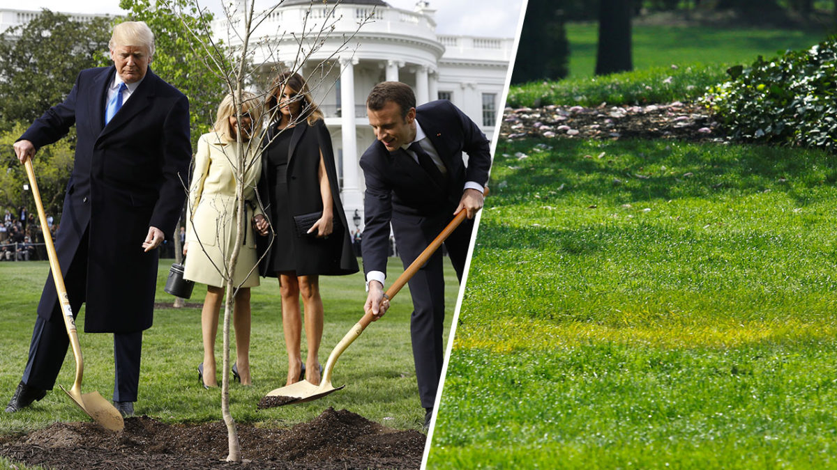 Ο Ντόναλντ Τράμπ «ξερίζωσε» το πεσκέσι του Εμμανουέλ Μακρόν. Η εφημερίδα Bild υποστηρίζει με βάση τα φωτογραφικά στιγμιότυπα που δημοσιεύει η βελανιδιά που φύτεψαν οι δυο πρόεδροι έμεινε κάτι λιγότερο από ένα 24ωρο στον κήπο του Λευκού Οίκου.