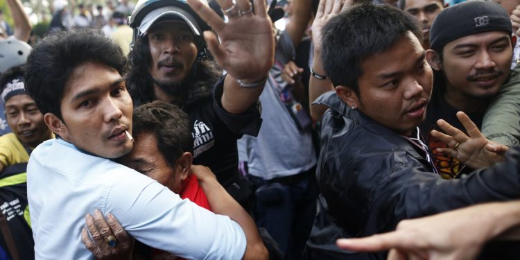Δεκάδες διαδηλωτές πέταξαν πλάκες και πλαστικές καρέκλες στο λεωφορείο αυτό που είχε κολλήσει στην κίνηση, κοντά σε ένα στάδιο στο οποίο περίπου 25.000 διαδηλωτές των «κόκκινων πουκαμίσων» είχαν συγκεντρωθεί, σύμφωνα με την αστυνομία, για να εκφράσουν την υποστήριξή τους στην κυβέρνηση.