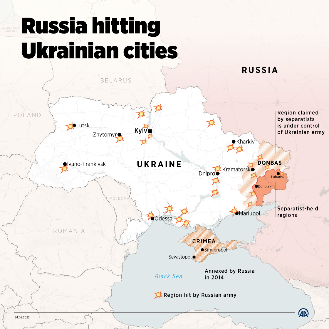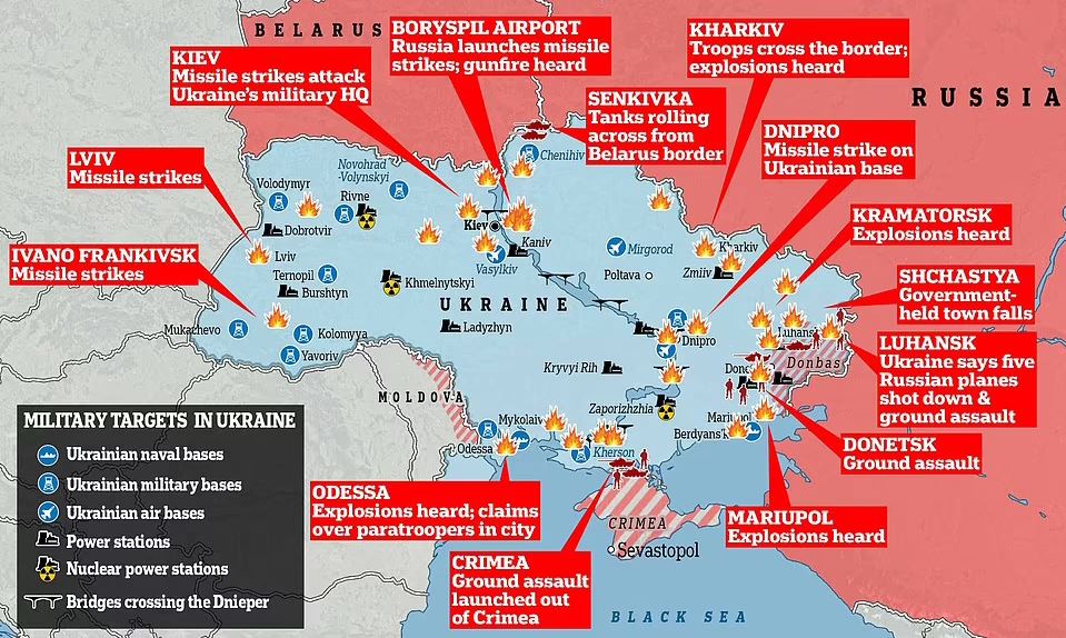 Χάρτες από διεθνή μέσα ενημέρωσης αποτυπώνουν τις κινήσεις και τις επιθέσεις που έχουν εξαπολύσει οι ρωσικές στρατιωτικές δυνάμεις για την εισβολή στην Ουκρανία, ενώ οι τελευταίες πληροφορίες αναφέρουν πως μαίνονται σκληρές μάχες στο Χάρκοβο. Την ίδια στιγμή ο πρόεδρος της Λευκορωσίας Αλεξάντρ Λουκασένκο πρότεινε σήμερα τη διεξαγωγή συνομιλιών ανάμεσα στη Ρωσία και στην Ουκρανία στο Μινσκ, σύμφωνα με το πρακτορείο ειδήσεων RIA.