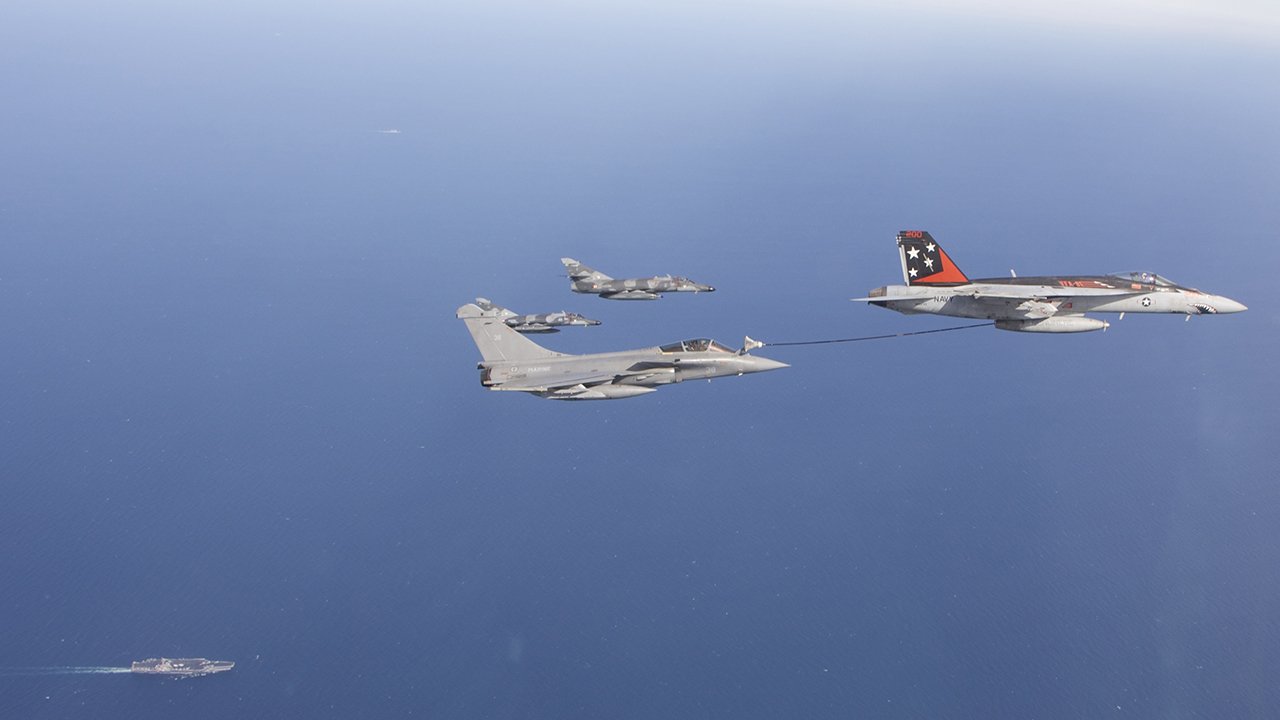 Στις φωτογραφίες απεικονίζεται ενα F / A-18E Superhornet – πρωταγωνιστής του τελευταίου χρονικού διαστήματος λόγω του ρόλου του στον πόλεμου κατά του Ισλαμικού Κράτους – να ανεφοδιάζει δυο γαλλικά Super Etendard κι ενα Rafale απο το αεροπλανοφόρο Charles De Gaulle, στην περιοχή του αμερικανικου αεροπλανοφόρου USS Carl Vinson (CVN 70), το οποίο μπορείτε να διακρίνεται στο βάθος της εντυπωσιακής φωτογραφίας.