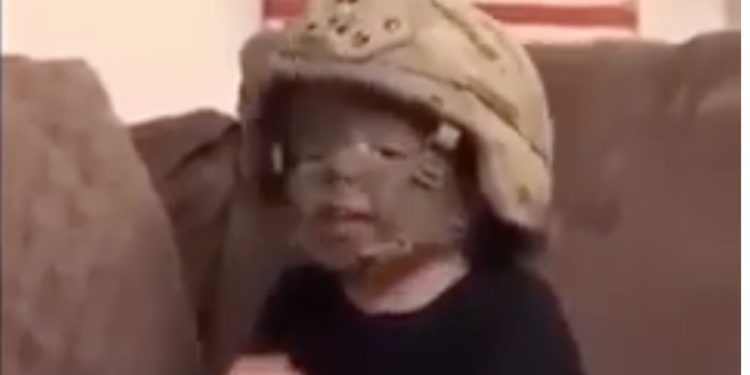 Βαμμένος στα χρώματα του πολέμου και με την παραλλαγή, αλλά ακόμη χωρίς εξάρτυση, ένας μπόμπιρας που τραγουδάει τον ύμνο του στρατού των ΗΠΑ, έχει γίνει viral στα μέσα κοινωνικής δικτύωσης αλλά στις ιστοσελίδες αμυντικών θεμάτων.