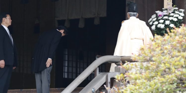 Ο Άμπε, ο συντηρητικός πρωθυπουργός της Ιαπωνίας, επισκέφθηκε σήμερα το πρωί το μνημείο αυτό στο κέντρο του Τόκιο, ένα χρόνο μετά την επιστροφή του στην εξουσία στις 26 Δεκεμβρίου του 2012.