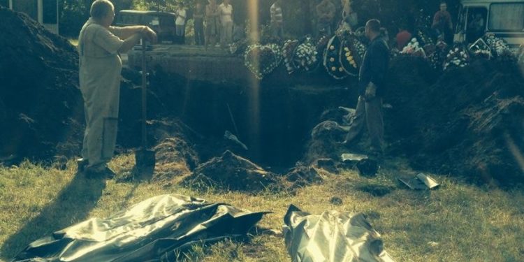 Τους 100.000 πλησιάζουν οι εσωτερικά εκτοπισμένοι στη χώρα, ενώ 130.000 άνθρωποι έχουν αναζητήσει καταφύγιο στη Ρωσία, σύμφωνα με τον ΟΗΕαδικός τάφος στο Σλαβιάνσκ που περιέχει περίπου είκοσι σορούς