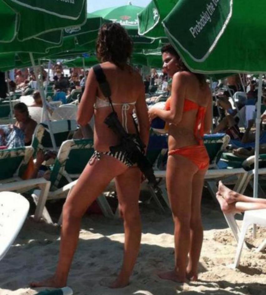 Η συγκεκριμένη φωτογραφία είναι απο το Τελ Αβίβ κι έχει βέβαια κάνει τον γύρο του διαδυκτιου. Υπαρχει όμως μια λογική εξήγηση στο γιατι μια νεαρη γυναίκα έχει ένα τουφέκι στην παραλία.