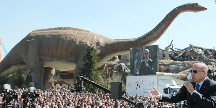 Ένας τεράστιος τυραννόσαυρος ρεξ αποκάλυπτε τα μεγάλα του δόντια, την ώρα που ο πρόεδρος της Τουρκίας Ρετζέπ Ταγίπ Ερντογάν εγκαινίαζε το μεγαλύτερο θεματικό πάρκο της χώρας, λίγο προτού εξαπολύσει μύδρους εναντίον της αντιπολίτευσης ενόψει των δημοτικών εκλογών.