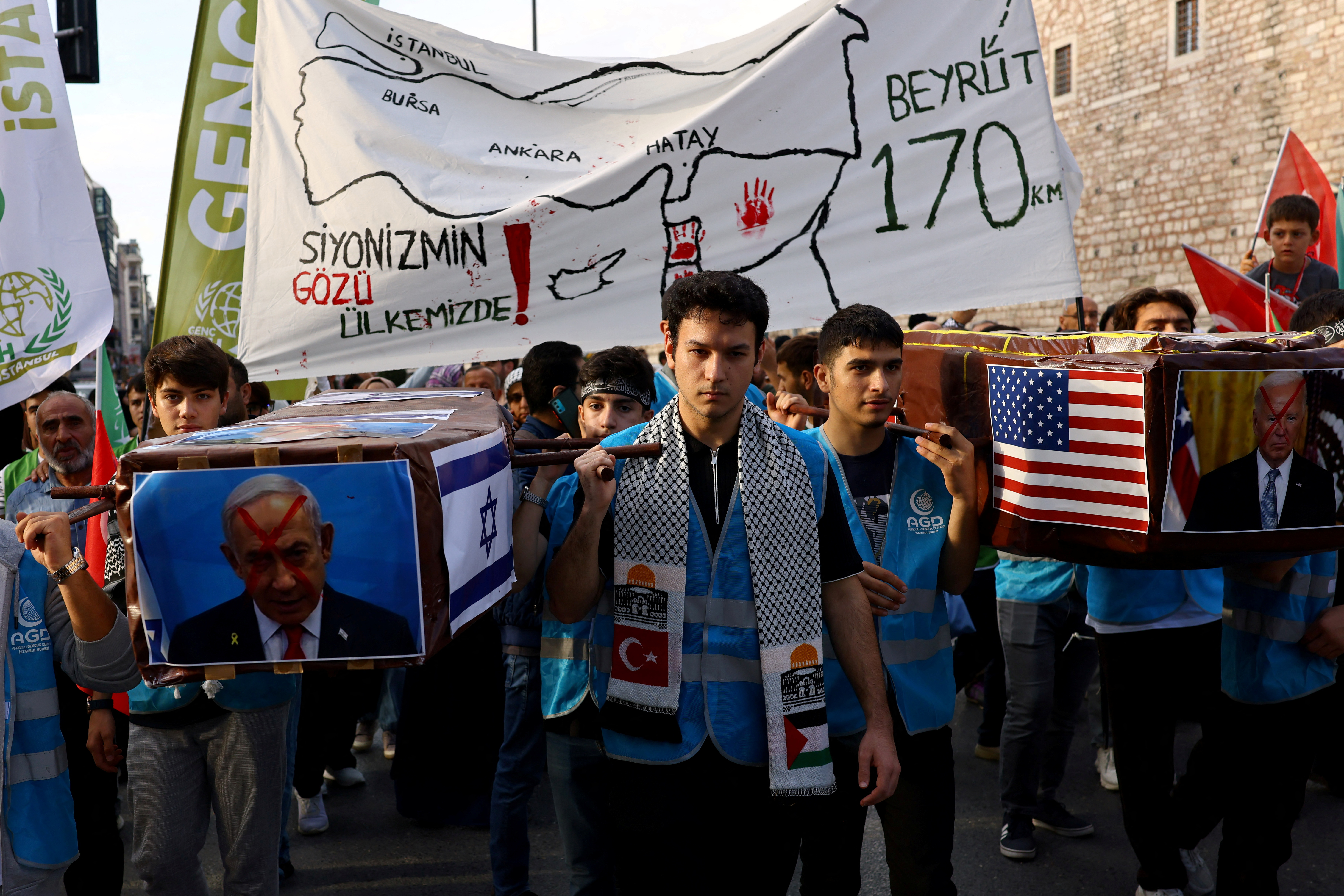 Σε πολλές πόλεις της Τουρκίας, συμπεριλαμβανομένης της Κωνσταντινούπολης και της Άγκυρας, γίνονται διαδηλώσιες για την επέτειο της 7ης Οκτωβρίου, προς υποστήριξη της Χαμάς, ενώ οι διαδηλωτές καίνε σημαίες του Ισραήλ αλλά και των ΗΠΑ.