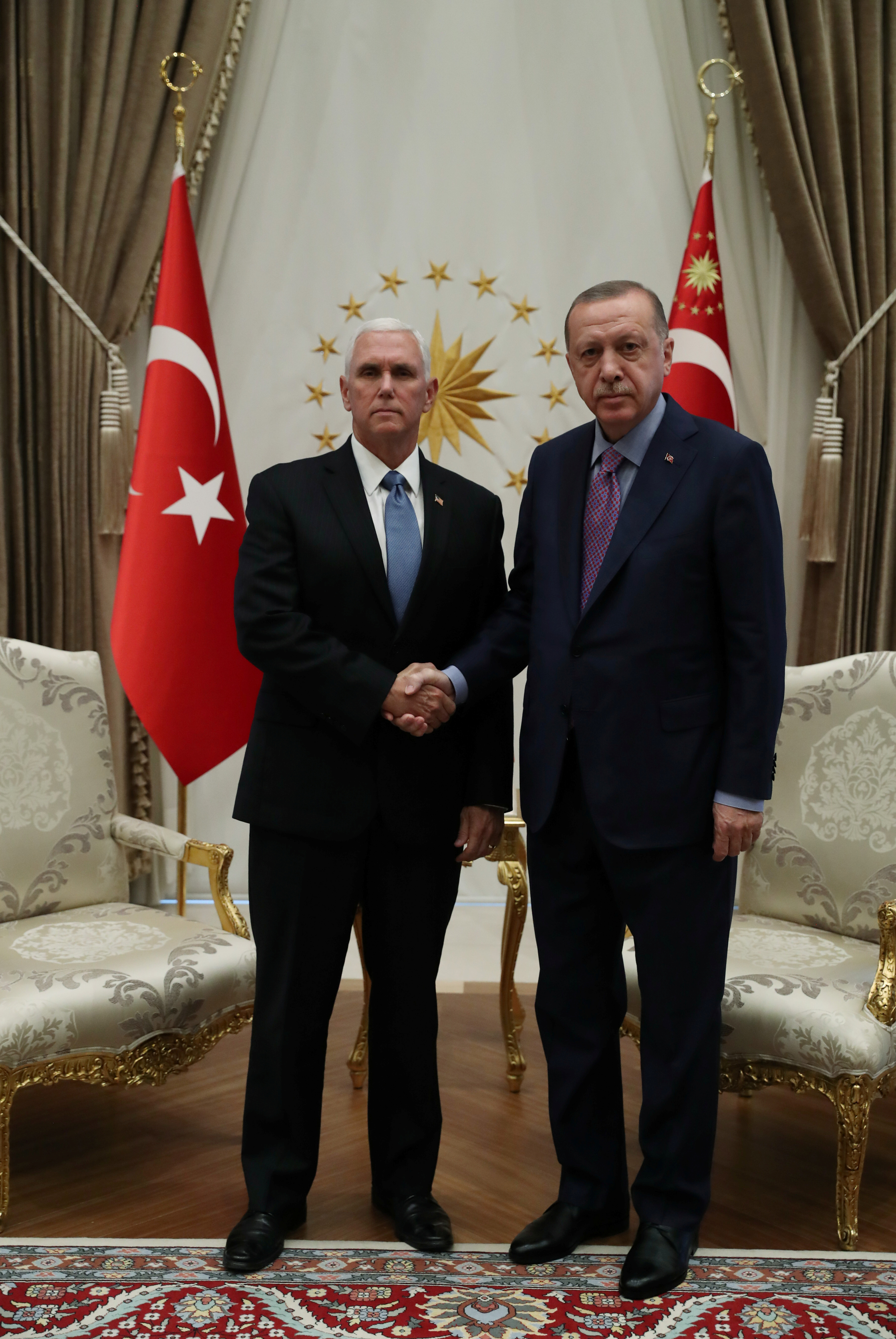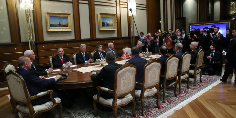 Ολοκληρώθηκε η σχεδόν δίωρη συνάντηση μεταξύ του Τούρκου προέδρου Ρετζέπ Ταγίπ Ερντογάν και του Αμερικανού αντιπροέδρου Μάικ Πενς, που έγινε στο προεδρικό μέγαρο στην Άγκυρα.