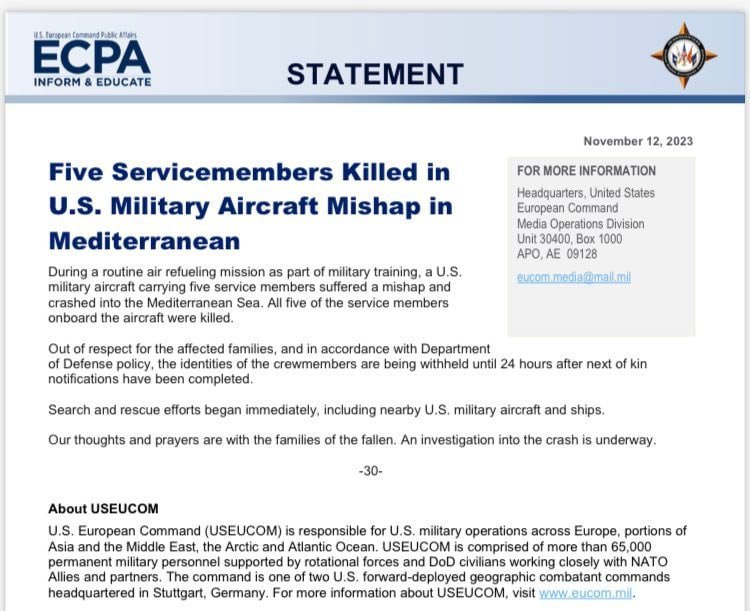 Five American troops were killed during a routine air refueling mission as part of military training, @US_EUCOM says. https://t.co/ziu1E2oFoT