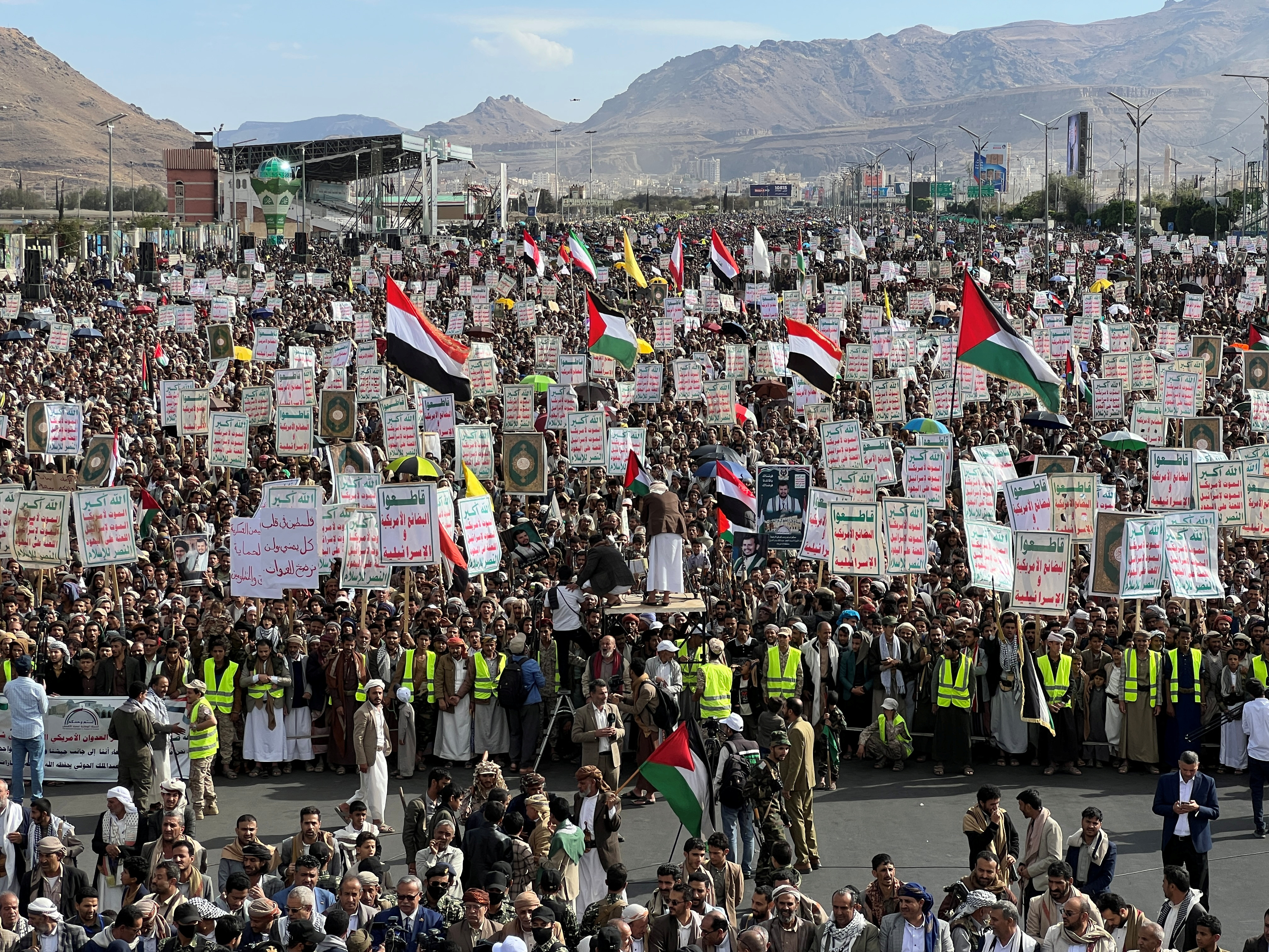 Στην πλατεία Σαμπίνε στη Σαναά, τόπο μεγάλων διαδηλώσεων αφότου ξέσπασε ο πόλεμος ανάμεσα στο Ισραήλ και τη Χαμάς στις 7 Οκτωβρίου 2023 στη Λωρίδα της Γάζας, το πλήθος ανέμιζε μεγάλες υεμενίτικες και παλαιστινιακές σημαίες, υψώνοντας όπλα, πανό ή αντίτυπα του Κορανίου.