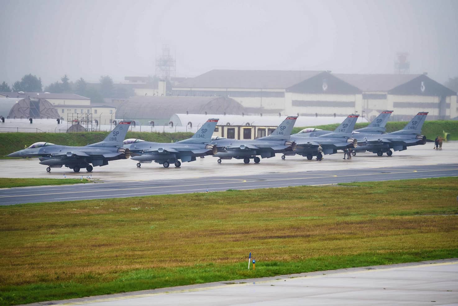 Αμερικανικά αεροσκάφη F-16 Fighting Falcons στοιχίζονται για το «βάδισμα του ελέφαντα», καθώς πλημμυρίζουν έναν αεροπορικό διάδρομο κατά τη διάρκεια άσκησης στην αεροπορική βάση Spangdahlem της Γερμανίας.