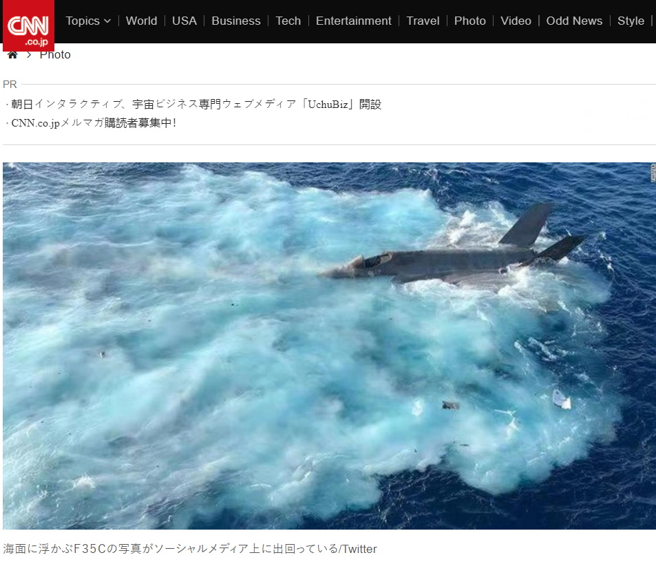 Επιπλέον το ιαπωνικό CNN δημοσιοποίησε μία φωτογραφία που δείχνει το F-35C μετά την πρόσκρουση στο κατάστρωμα του αεροπλανοφόρου USS Carl Vinson να επιπλέει στη θάλασσα.