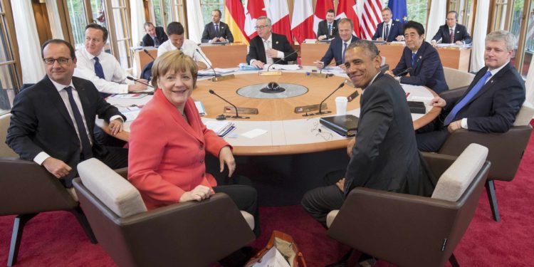 Την πρώτη ημέρα της συνόδου η οποία διεξάγεται στις βαυαρικές Άλπεις, ο πρόεδρος των ΗΠΑ Μπαράκ Ομπάμα και η Αγγελα Μέρκελ έκριναν ότι οι κυρώσεις θα πρέπει να διατηρηθούν μέχρι η Ρωσία να «σεβαστεί την κυριαρχία της Ουκρανίας».