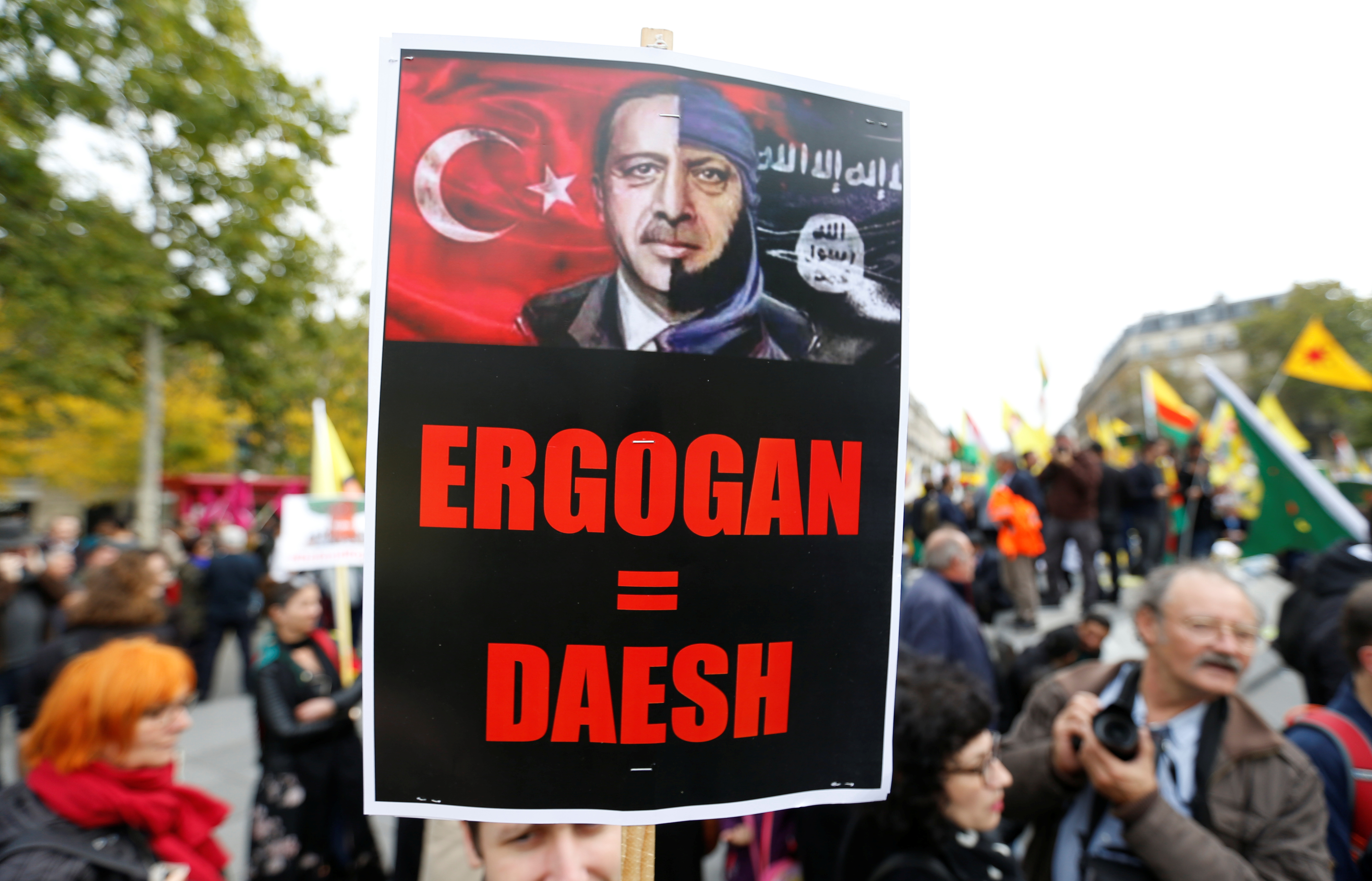 «Αφήστε την Τουρκία να σφαγιάσει τους Κούρδους, έτσι τους ευχαριστείτε επειδή νίκησαν το Νταές; (σ.σ. το Ισλαμικό Κράτος στα αραβικά)» και «Μετά τον Μπαγκντάντι, θα έρθει η σειρά του Ερντογάν», έγραφαν κάποια από τα πλακάτ που κρατούσε το πλήθος.