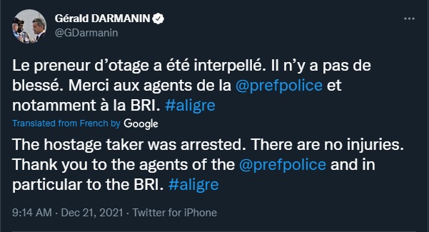«Ο δράστης της ομηρείας συνελήφθη. Δεν υπάρχουν τραυματίες. Ευχαριστώ τα μέλη της αστυνομίας», επεσήμανε στο Twitter ο Νταρμανέν.