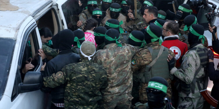 Μια ομάδα της Διεθνούς Επιτροπής του Ερυθρού Σταυρού (ICRC) στη Γάζα παρέλαβε τις τρεις Ισραηλινές γυναίκες ομήρους που απελευθέρωσε σήμερα, Κυριακή 19 Ιανουαρίου 2025, η Χαμάς, στο πλαίσιο της συμφωνίας εκεχειρίας με το Ισραήλ.
