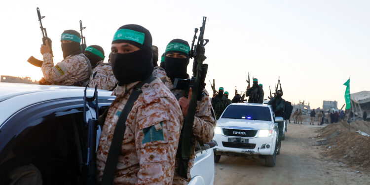 Όπως σε κάθε απελευθέρωση ομήρων, δεκάδες ένοπλοι μαχητές της Χαμάς, με καλυμμένα πρόσωπα, αναπτύχθηκαν σήμερα το πρωί γύρω από μια εξέδρα, αυτή τη φορά στη Χαν Γούνις, στο νότιο τμήμα της Γάζας