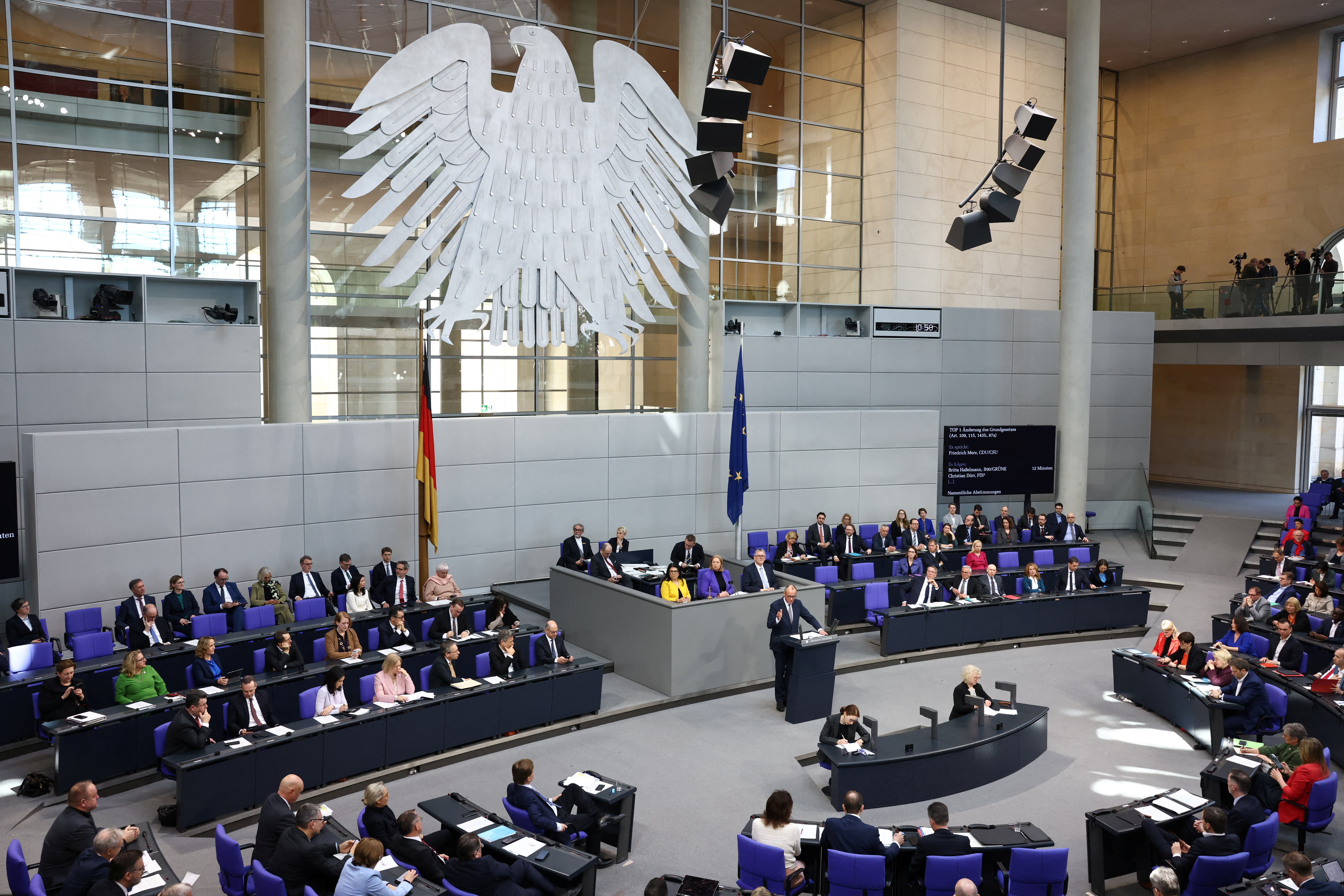 H Ομοσπονδιακή Βουλή (Bundestag) υπερψήφισε τη συνταγματική μεταρρύθμιση για την άρση του «φρένου χρέους», που θα ενισχύσει την χρηματοδότηση για την άμυνα και τις υποδομές στην Γερμανία.