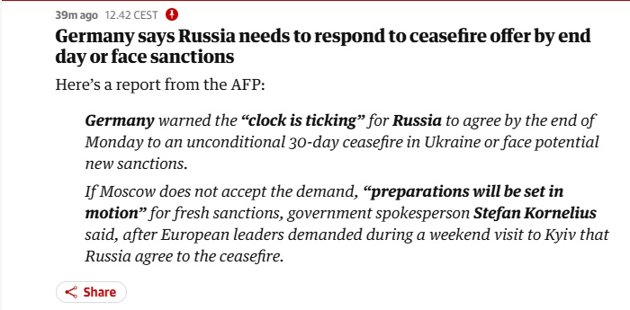 Η Γερμανία ήταν η πρώτη από τις τέσσερις χώρες που μετείχαν στην συνάντηση του Κιέβου το περασμένο Σάββατο 10/5/2025 που υπενθύμισε ότι η απόφασή τους για επιβολή νέων αυστηρότερων κυρώσεων στη Ρωσία εφόσον δεν δεχθεί άνευ όρων κατάπαυση του πυρός εξακολουθεί να βρίσκεται σε ισχύ.