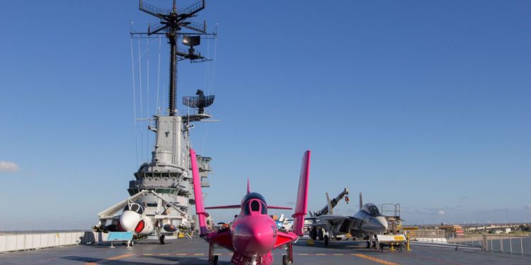 Μ’ ένα ροζ μαχητικό αεροσκάφος F9F-8 «Cougar» γίνεται η ενημέρωση κατα του καρκίνου του μαστού στο Λέξινγκτον των ΗΠΑ.