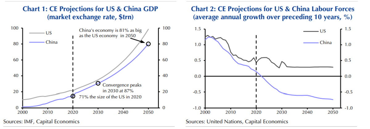 Εάν η Κίνα έχει μία ευκαιρία να βρεθεί στην κορυφή του κόσμου, θα είναι γύρω στο 2030, όμως ακόμα και εάν τα καταφέρει, αυτό θα είναι πρόσκαιρο, αφού οι δυσμενείς δημογραφικές συνθήκες θα την ρίξουν και πάλι στη δεύτερη θέση, σύμφωνα με την Capital Economics.