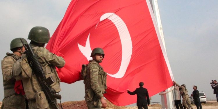 Mάχη σημαιών στα όρια του κουρδικού Κομπάνι της Συρίας οι αγωνιστές του οποίου ήδη το ελέγχουν σχεδόν ολοκληρωτικά και με την βούλα των Αμερικανών! Η Τουρκία που για πολύ μεγάλο χρονικό διάστημα έκανε …κόνξες για βοήθεια – αν δεν σαμποτάριζε- την άμυνα των Κούρδων, έσπευσε χθες λίγες ήμερες μετά τα ευχάριστα νέα του τερματισμού των συγκρούσεων στο Κομπάνι, να αναρτήσει μια τεράστια τουρκική σημαία στο σημείο μηδέν των συνόρων, στη συνοικία Μουρσιτπινάρ της επαρχίας Σουρούτς της Σανλιούρφα. Συγκεκριμένα τοποθετήθηκε ιστός ύψους 40 μέτρων στον οποίο οι στρατιώτες ανέβασαν την τουρκική σημαία διαστάσεων 8 Χ 12 μ.