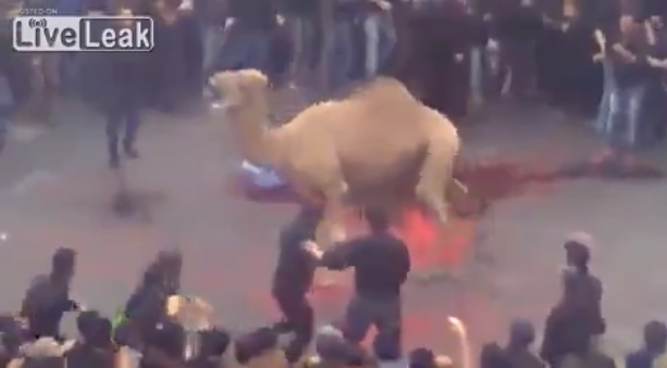 Το έθιμο βάρβαρο προβλέπει τη «θυσία» μιας καμήλας. Το πλήθος παραληρεί μόλις δέχεται το πρώτο χτύπημα. Αλλά η καμήλα δείχνει αποφασισμένη να παλέψει για τη ζωή της μη μπορώντας προφανώς να καταλάβει σε τι εξυπηρετεί η θυσία της.