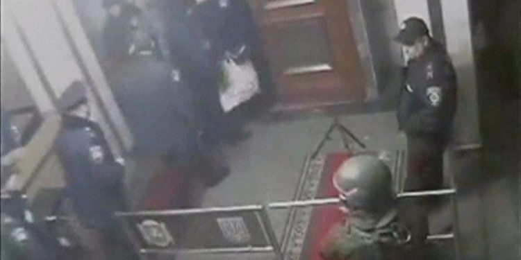 Μια φωτογραφία από κάμερα ασφαλείας μέσα στη Βουλή της Κριμαίας δείχνει τους ένοπλους Ρώσους που έχουν υπό τον έλεγχό τους το κτίριο να παρακολουθούν τους υπαλλήλους που αποχωρούν. Είναι ντυμένοι με στρατιωτικές στολές χωρίς διακριτικά και βαρειά οπλισμένοι. Είναι προφανές ότι πρόκειται για Ρώσους οι οποίοι μεθοδικά εκτελούν σχέδιο στρατιωτικής επέμβασης στην Κριμαία. Η επέμβαση προκάλεσε ήδη την αμερικανική αντίδραση.