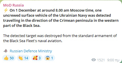 «Περί τις 08:00 ώρα Μόσχας (σ.σ. 07:00 ώρα Ελλάδας), μη επανδρωμένο σκάφος του ουκρανικού ναυτικού (USV) εντοπίστηκε σε δυτικό τομέα της Μαύρης Θάλασσας κινούμενο προς τη χερσόνησο της Κριμαίας», σύμφωνα με το υπουργείο, που πρόσθεσε ότι «ο στόχος καταστράφηκε».