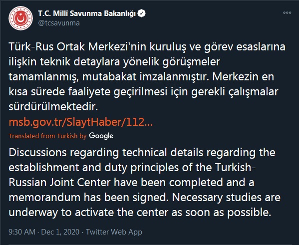 «Συμφωνία υπογράφηκε στο τέλος των συνομιλιών σχετικά με τις τεχνικές λεπτομέρειες της δημιουργίας του κοινού τουρκορωσικού κέντρου και με τις αρχές λειτουργίας του», ανακοίνωσε μέσω του Twitter το τουρκικό υπουργείο Άμυνας.