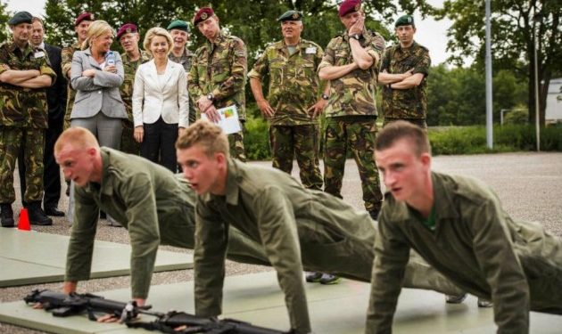Στην φωτογραφία η Υπουργός Άμυνας της Ολλανδίας Jeanine Hennis-Plasschaert και δεξιά η Γερμανίδα Υπουργός Άμυνας Ursula von der Leyen φαινεται να απολαμβάνουν την δύναμη που έχουν στα χέρια τους, περικυκλωμένες απο τις – όπως δείχνει η φωτογραφία, προβληματισμένες – ένοπλες δυνάμεις των δυο χωρών. Άτυχοι βέβαια οι στρατιώτες που κάνουν τις κάμψεις αλλά όλα έχουν το τίμημα τους…!