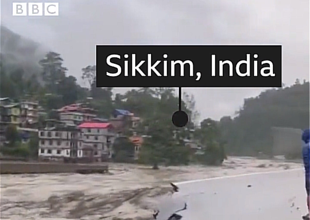 Τεράστια ποσότητα βροχής έπεσε χθες, Τετάρτη, σε σύντομο χρονικό διάστημα στη λίμνη Λόνακ, που βρίσκεται στους πρόποδες ενός παγετώνα, προκαλώντας αστραπιαίες πλημμύρες στην κοιλάδα του ποταμού Τεέστα, περίπου 150 χιλιόμετρα βόρεια της Γκανγκτόκ, της πρωτεύουσας του κρατιδίου Σικίμ, κοντά στα σύνορα με την Κίνα και το Νεπάλ.