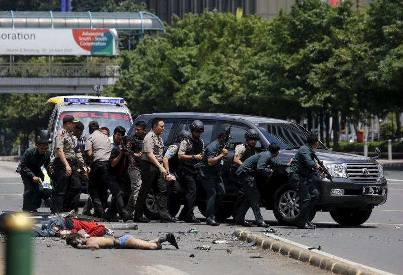 Ένοπλοι πραγματοποίησαν σήμερα επίθεση με όπλα και βόμβες σκοτώνοντας τουλάχιστον έξι ανθρώπους στο κέντρο της πρωτεύουσας της Ινδονησίας, ανακοίνωσε η αστυνομία, σε μια επίθεση που σημειώθηκε έπειτα από την απειλή τζιχαντιστών της οργάνωσης Ισλαμικό Κράτος ότι θέτουν τη χώρα στο «στόχαστρό» τους. Σύμφωνα με μέσα ενημέρωσης, έξι βόμβες εξερράγησαν σε διάφορα σημεία της Τζακάρτας και αυτόπτης μάρτυρας δήλωσε στο Ρόιτερς ότι είδε τρεις νεκρούς να κείτονται στο έδαφος και μια συμπλοκή να είναι σε εξέλιξη. Μια έκρηξη σημειώθηκε σε καφετέρια της αλυσίδας Starbucks και δυνάμεις ασφαλείας εισήλθαν αργότερα στο κτίριο.
