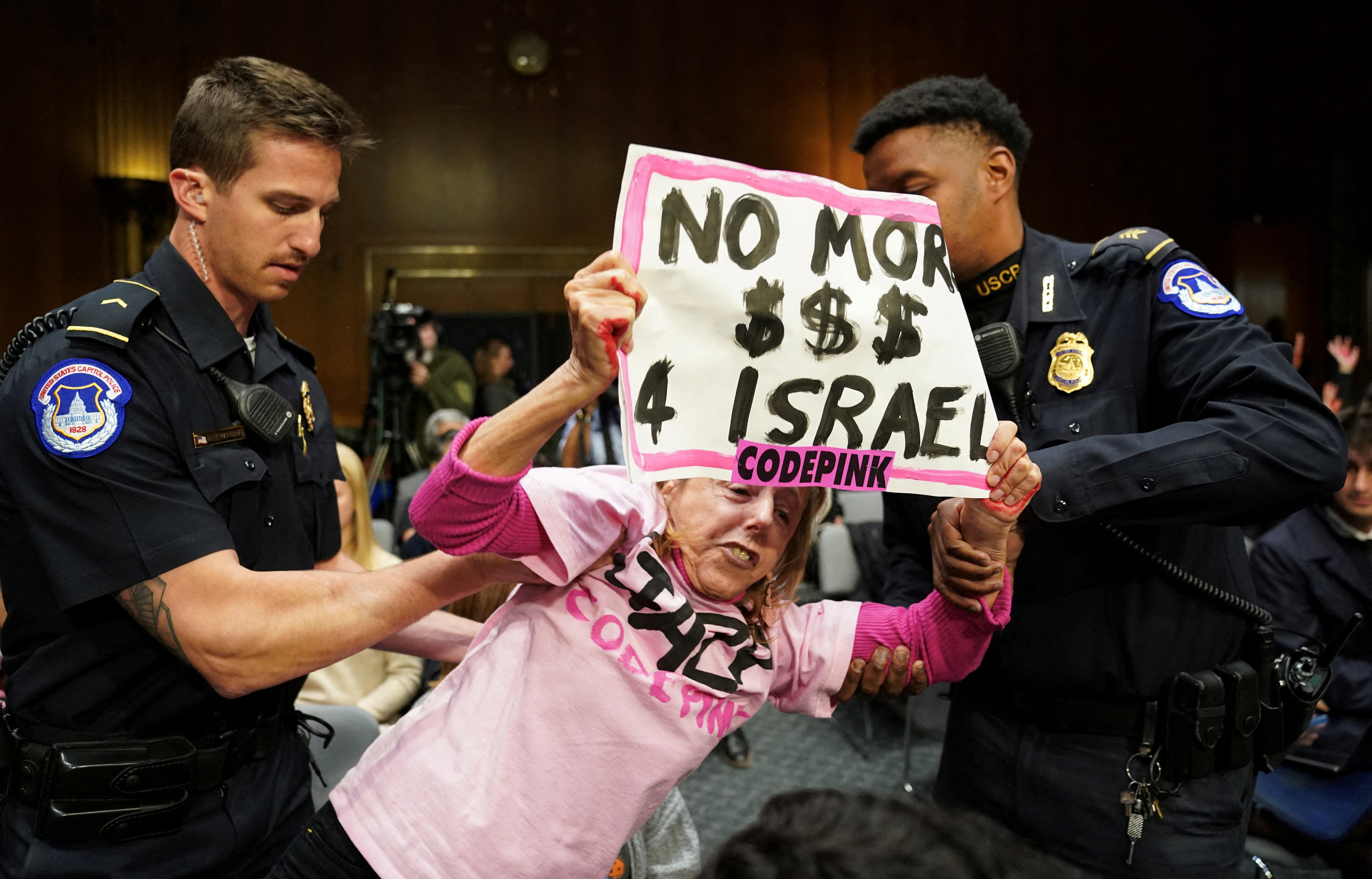 Κατά την έναρξη της ακρόασης, αντιπολεμικοί διαδηλωτές ύψωσαν τα βαμμένα με κόκκινη μπογιά χέρια τους στον αέρα. Η αστυνομία του Καπιτωλίου τους απομάκρυνε στη συνέχεια από την αίθουσα αφού φώναξαν συνθήματα όπως «Κατάπαυση του πυρός τώρα!», «Προστατέψτε τα παιδιά της Γάζας!» και «Σταματείστε να χρηματοδοτείτε τη γενοκτονία».