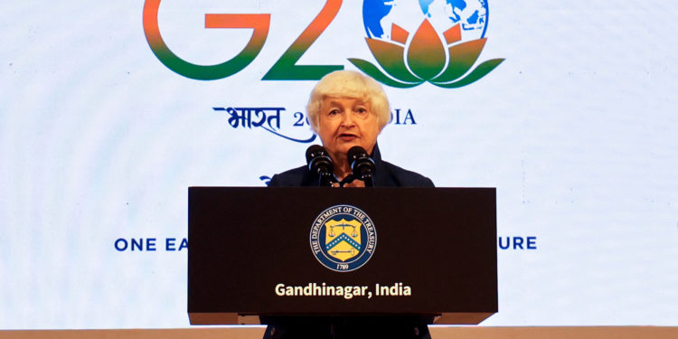 Η Αμερικανίδα υπουργός μετέχει σήμερα στην Γκαντιναγκάρ, στη δυτική Ινδία, σε σύνοδο των υπουργών Οικονομικών της G7, ενόψει της συμμετοχής της στην σύνοδο των υπουργών Οικονομικών της G20 στην ίδια πόλη αύριο, Δευτέρα, και μεθαύριο, Τρίτη.