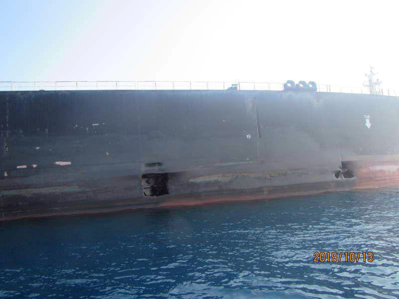 Οι φωτογραφίες, οι οποίες δόθηκαν στη δημοσιότητα από την εταιρεία στην οποία ανήκει το πετρελαιοφόρο, την κρατική εταιρεία Ιρανική Εθνική Εταιρεία Πετρελαιοφόρων (NITC) φέρουν χθεσινή ημερομηνία και δείχνουν δύο οπές κάτω από την ίσαλο γραμμή στην δεξιά πλευρά του πλοίου.