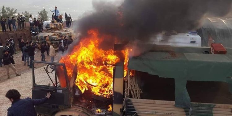 Μεγάλη ομάδα οργισμένων πολιτών επιτέθηκε και κατέλαβε Τουρκική στρατιωτική βάση κοντά στην ιρακινή πόλη Dohuk, βάζοντας φωτιά σε εξοπλισμό και οχήματα.