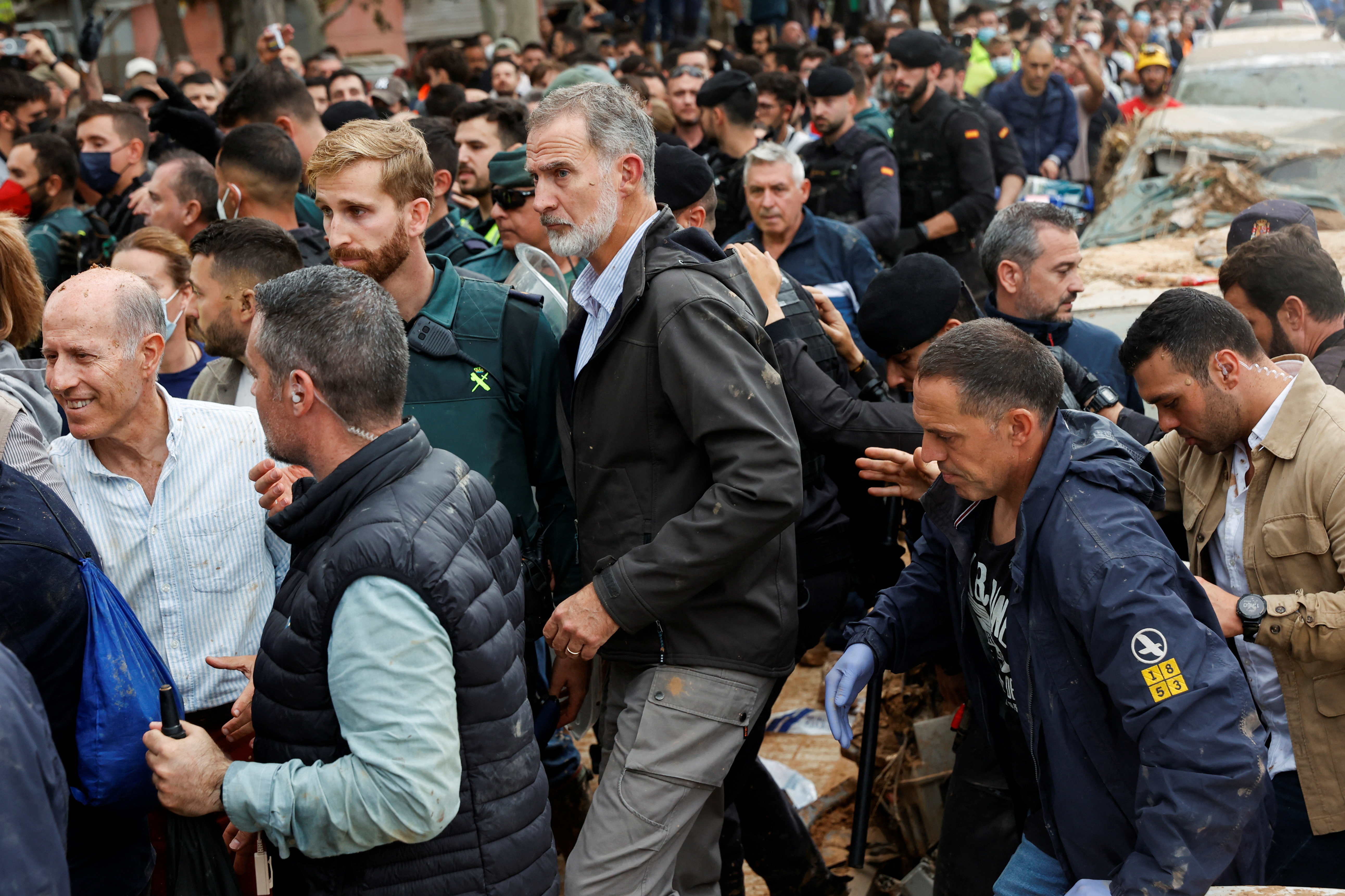 Συνθήματα κατά του πρωθυπουργού, Πέδρο Σάντσεθ, και του τοπικού κυβερνήτη της περιφέρειας της Βαλένθιας στην Ισπανία, Κάρλος Μαθόν, όταν μαζί με τον βασιλιά Φίλιππο και την βασίλισσα Λετίθια επισκέφτηκαν την Παϊπόρτα, που μέχρι στιγμής μετράει τα περισσότερα θύματα και τις μεγαλύτερες καταστροφές από τις πλημμύρες που προκάλεσε το πέρασμα της θεομηνίας Ντάνα, φώναξε το συγκεντρωμένο πλήθος.