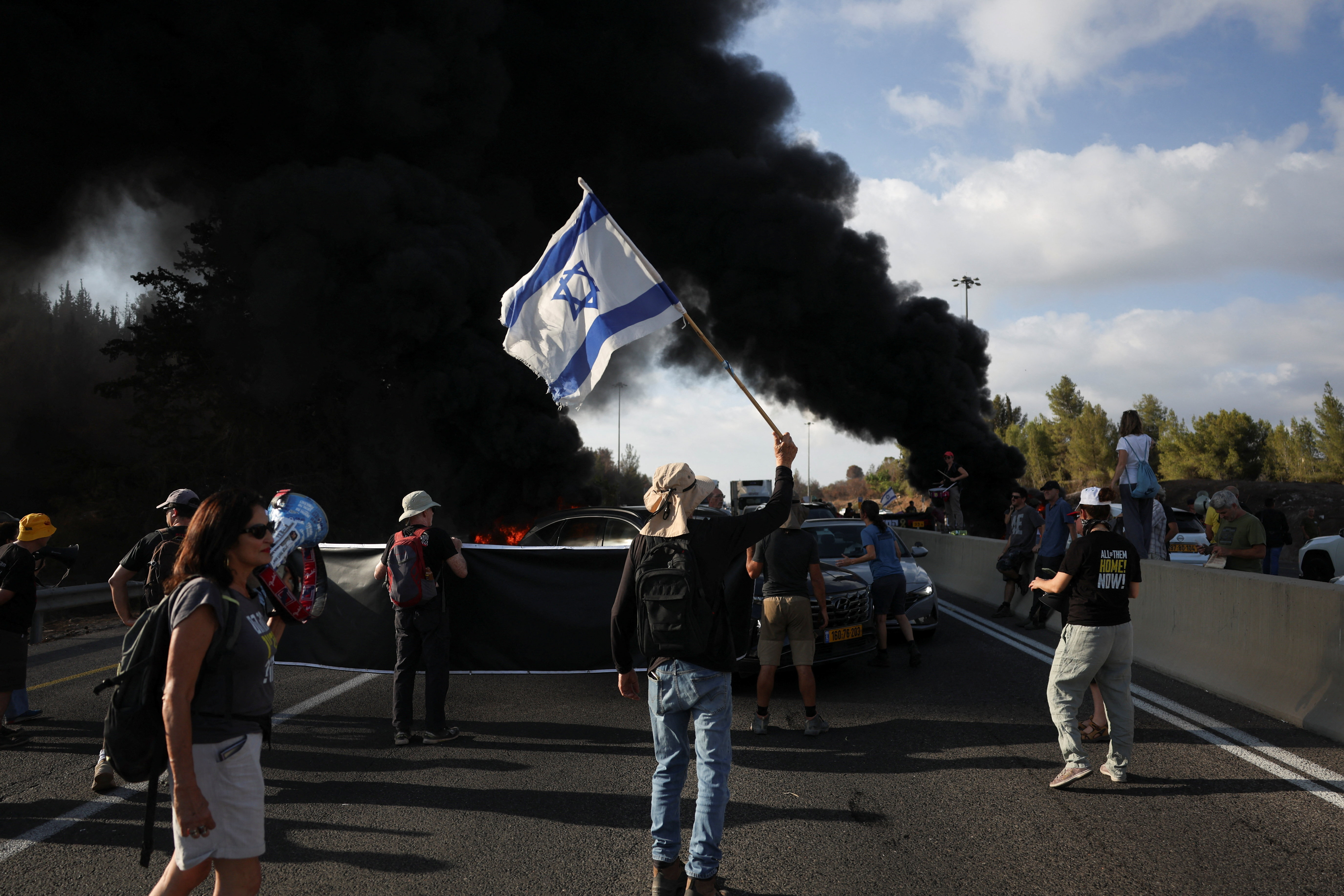 «Αύριο θα οδηγήσουμε τη χώρα σε πάγωμα», δήλωσε απευθυνόμενη στους διαδηλωτές η Εϊνάβ Ζανγκάουκερ, ο γιος της οποίας, ο Ματάν, είναι ένας από τους περίπου 20 ζωντανούς ομήρους που εξακολουθούν να κρατούνται στη Λωρίδα της Γάζας. Η Ζανγκάουκερ αναφερόταν σε προγραμματισμένη για σήμερα πανεθνική απεργία στο Ισραήλ.