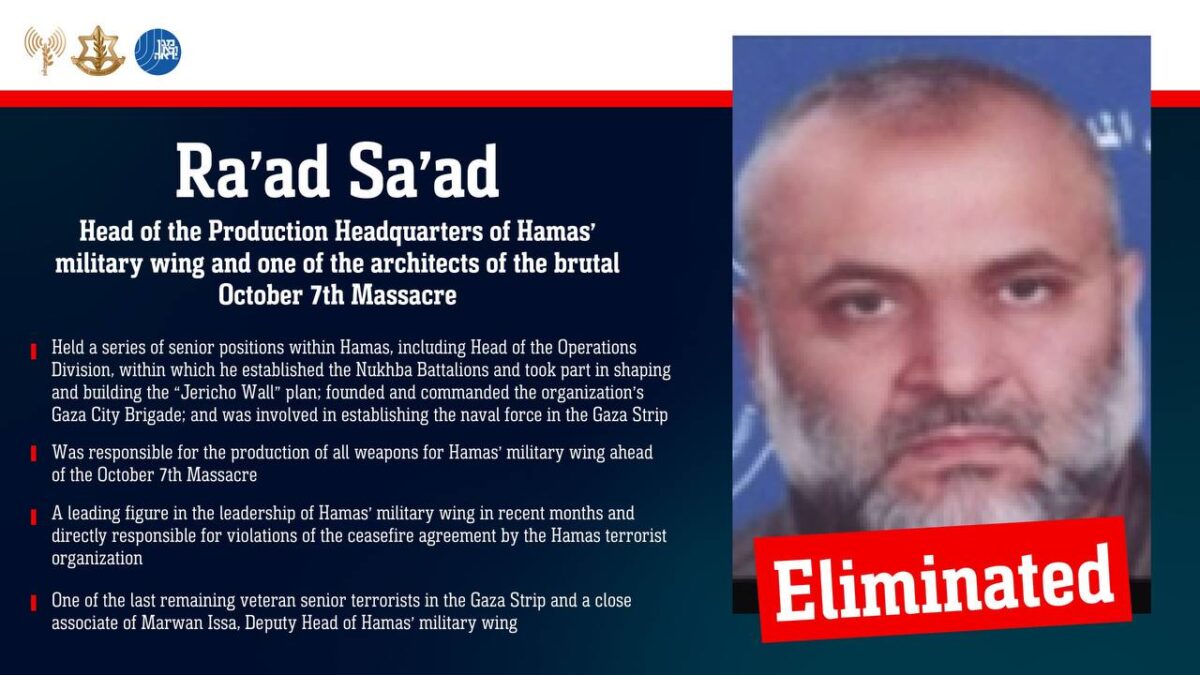 Το Ισραήλ εξουδετέρωσε σήμερα 13/12/2025 τον υψηλόβαθμο αξιωματούχο της Χαμάς Ραέντ Σαΐντ με στοχευμένο πλήγμα στη Γάζα, σύμφωνα με ισραηλινά ΜΜΕ που επικαλούνται πηγές.
