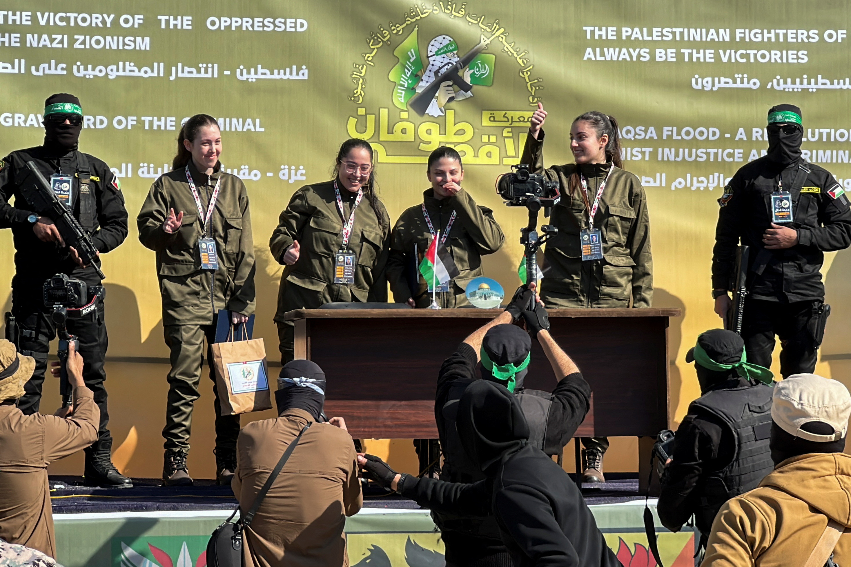 4 female hostages are paraded on Hamas stage in Gaza that says “Zionism will not win” before thousands of jeering Palestinians after 477 days in captivity. Meanwhile the Red Cross, who also took part in the fiasco on stage stands there watching. Gaza is a deranged society. pic.twitter.com/JvjmDtjgYV