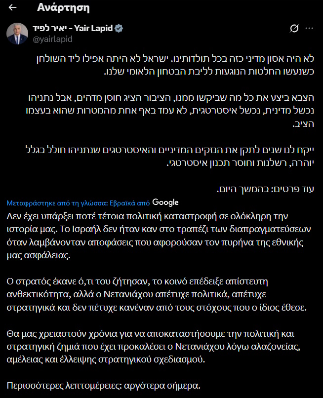 Ισραήλ: «Πολιτική καταστροφή» η κατάπαυση του πυρός με το Ιράν, λέει ο Γιαΐρ Λαπίντ