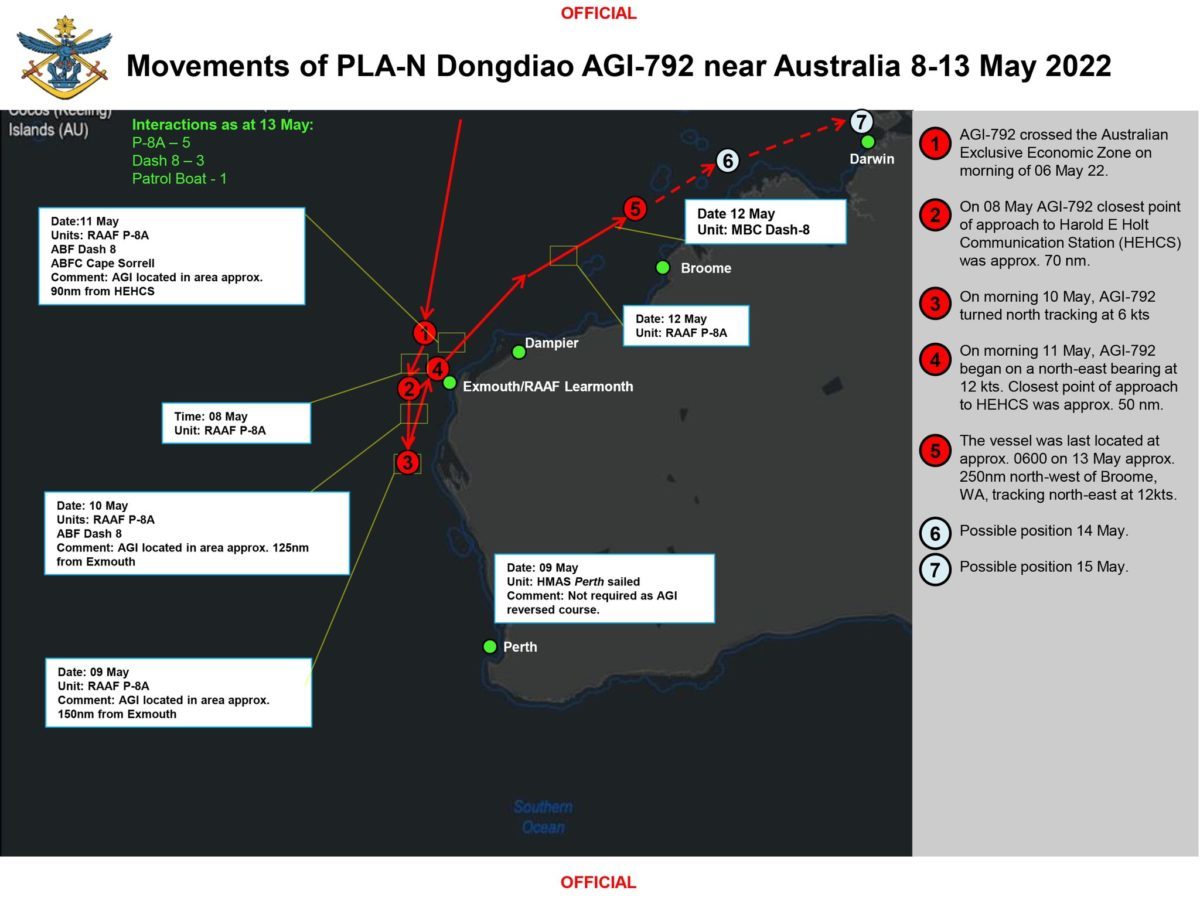 Ο Αυστραλός Υπουργός Άμυνας είχε δηλώσει πως το το πλοίο «Haiwangxing» κλάσης Dongdiao πέρασε από τη Ζώνη Οικονομικού Αποκλεισμού της Αυστραλίας στις 6 Μαΐου και πλησίασε σε απόσταση 50 ναυτικών μιλίων από στρατιωτικές υποδομές και εγκαταστάσεις πληροφοριών στη δυτική ακτή της Αυστραλίας.