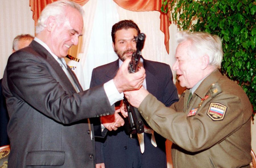 Με ειδικά διαμορφωμένο αεροσκάφος, εφοδιασμένο με όλο τον απαραίτητο ιατρικό εξοπλισμό, μεταφέρθηκε στη Μόσχα για νοσηλεία ο 93χρονος δημιουργό του πιο “διάσημου” αυτόματου πυροβόλου όπλου στον κόσμο, του AK-47, γνωστού ως «Καλάσνικοφ». Στη φωτογραφία δίνει ένα Καλάσνικοφ στον τότε ΥΕΘΑ Άκη Τσοχατζόπουλο.