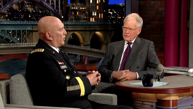 Ο Αρχηγός του Αμερικανικού Στρατού στρατηγός Οντιέρνο καλεσμένος σ΄ ένα από τα πιο γνωστά τηλεοπτικά show των ΗΠΑ. Αυτό του David Letterman. Στο απόσπασμα από την τηλεοπτική συνέντευξη που παραχώρησε μιλά για την θητεία του στο Ιράκ ,τη συμμετοχή του στη σύλληψη του Σαντάμ Χουσεϊν, τον γιό του που επίσης έχει υπηρετήσει στο Ιράκ και για πολλά άλλα σημαντικά. Όπως για παράδειγμα μιλά για όσους στρατιώτες επιστρέφουν από ζώνες πυρός και το μόνο που ζητούν είναι μια δουλειά. Λέει ξεκάθαρα την άποψή του.