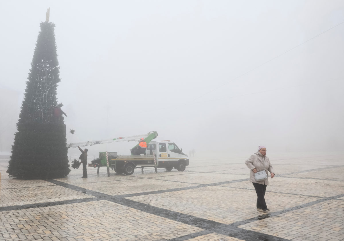 Στον απέραντο χώρο μπροστά από τον ηλικίας εκατοντάδων χρόνων καθεδρικό ναό της Αγίας Σοφίας είναι παραδοσιακά στημένο ένα τεράστιο αειθαλές δέντρο τα Χριστούγεννα. Αλλά οι αξιωματούχοι επέλεξαν φέτος ένα τεχνητό δέντρο μήκους 12 μέτρων με φώτα εξοικονόμησης ενέργειας που τροφοδοτούνται από μια γεννήτρια. Οι Ορθόδοξοι Χριστιανοί αποτελούν την πλειοψηφία των 43 εκατομμυρίων κατοίκων της Ουκρανίας.