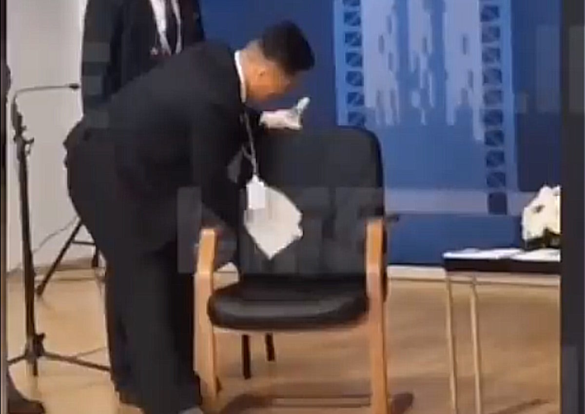 Ο Βορειοκορεάτης ψέκασε και σκούπισε το κάθισμα, τα μπράτσα και τα πόδια της καρέκλας ακόμα και την περιοχή γύρω από αυτή, ενώ σωματοφύλακας του Κρεμλίνου παρακολουθούσε, μάλλον σαστισμένος. Στη συνέχεια άλλος Βορειοκορεάτης φρουρός έδωσε κάποιου είδους διαταγής στον άνδρα που έκανε την απολύμανση.