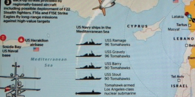 Σε πρώτη βάση θα εκτοξευθούν μαζικά πύραυλοι Τόμαχοκ από τα πολεμικά πλοία που οπως βλέπετε στον χάρτη που δημοσιευσαν οι Times βρίσκονται ήδε σε απόσταση βολής.
