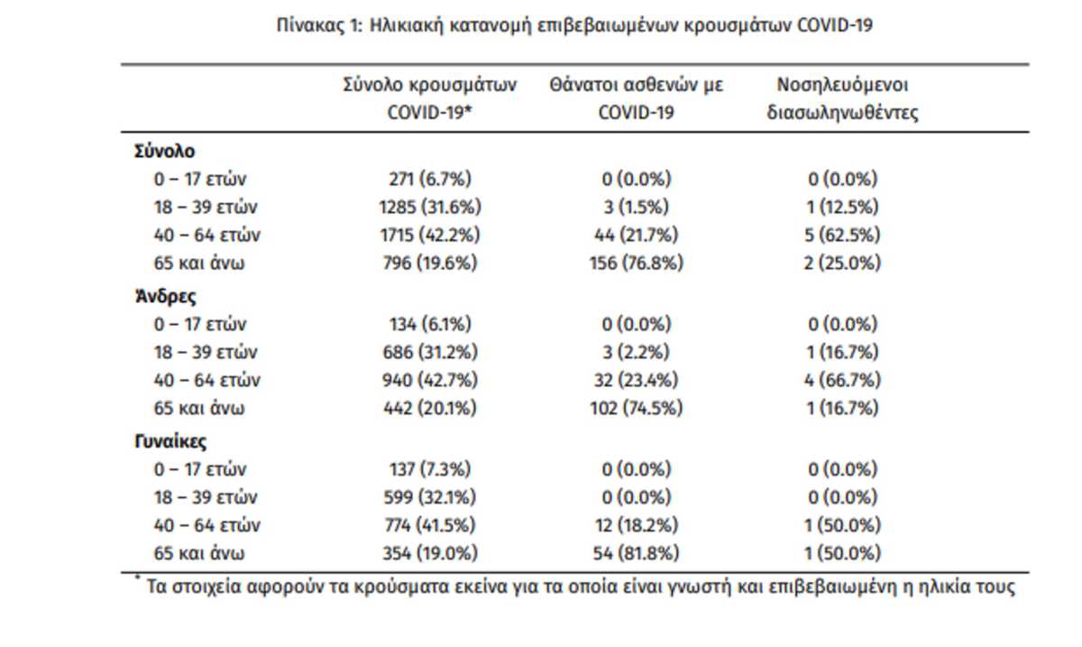 Η μέση ηλικία των κρουσμάτων είναι 46 έτη (εύρος 0 έως 102 ετών), ενώ η μέση ηλικία των θανάτων είναι 76 έτη (εύρος 35 έως 102 ετών). Η ηλικιακή κατανομή των (α) συνολικών κρουσμάτων, (β) των περιστατικών που κατέληξαν σε θάνατο και (γ) των ασθενών που νοσηλεύονται διασωληνωμένοι, είναι η ακόλουθη: