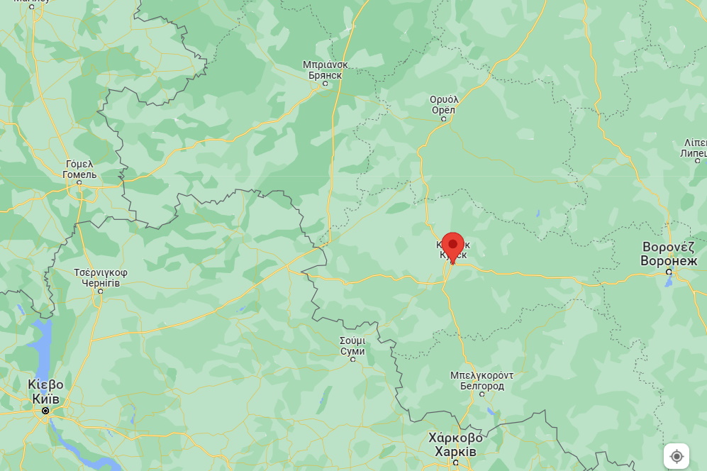 Στον χάρτη φαίνεται η απόσταση του Κουρσκ από τα ουκρανικά σύνορα, καθώς και η απόσταση του Μπριάνσκ από το Κουρσκ όπου – κατά τις ρωσικές αρχές – καταρρίφθηκαν τα δύο drones.