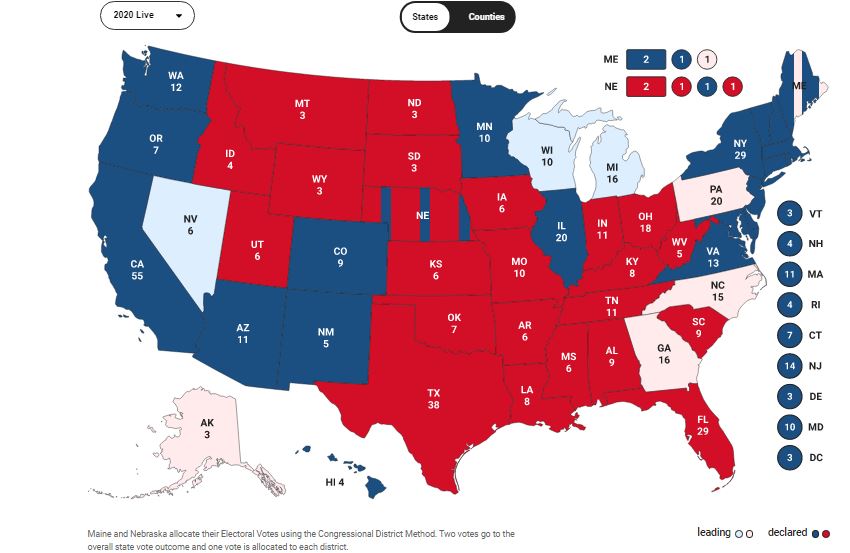 Ωστόσο κατά τη διάρκεια της νύχτας φαίνεται να κλείδωσαν και οι περιφέρειες του Μίσιγκαν και Ουϊσκόνσιν, με τον Μπαιντεν να υπολείπεται μόλις 6 εκλέκτορες για να πιάσει τον «μαγικό» και πολυπόθητο αριθμό 270.